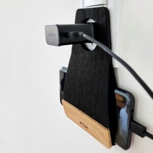 Realizado en fieltro, acrílico y madera lustre natural, cumple la función de sostener el teléfono durante la carga evitando situaciones… -