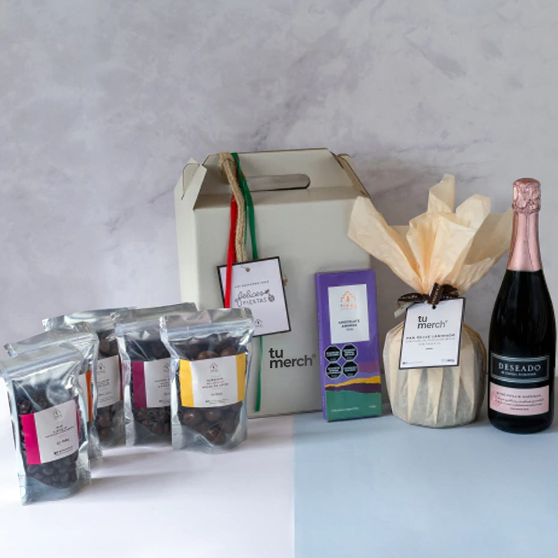 $1.00Incluye: - Espumante "Deseado" (Familia Schroeder) - Pan Dulce laminado de chocolate belga con crocante de amaretti de almendras - Doypack… -
