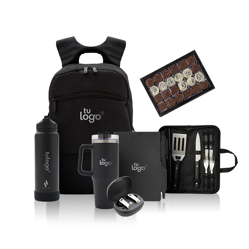 $1.00Incluye: Mochila Botella Jarro termico Cuaderno + Boligrafo Set chicago Bombones "Feliz Día" -