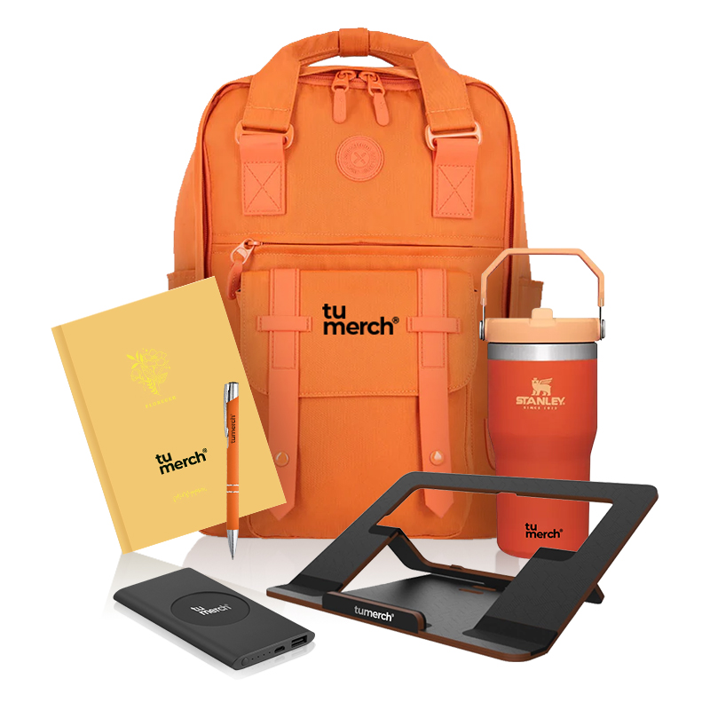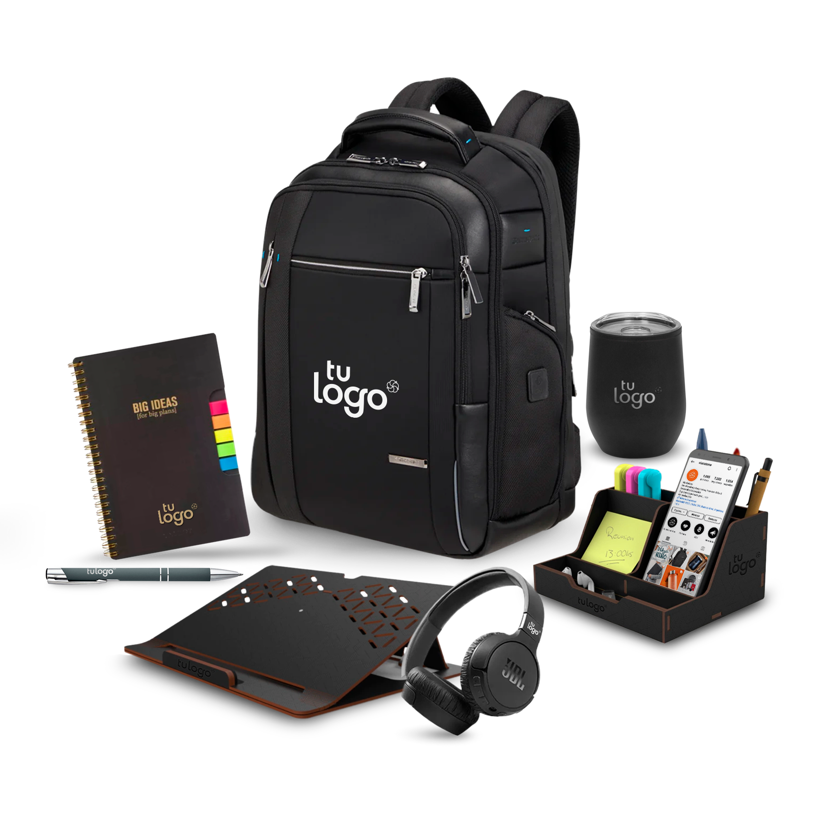 $1.00Incluye: Mochila Cuaderno Jarro Bolígrafo Soporte Notebook Auriculares Organizador -
