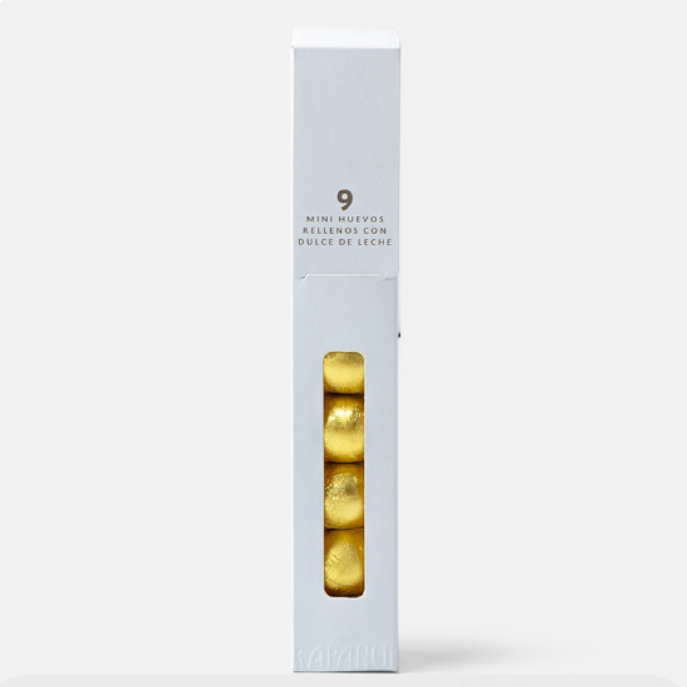 Medidas: 3cm. x 2cm. cada huevo. Packaging: 19cm. x 3cm. x 2cm. Cáscara: Chocolate con leche. Relleno: Dulce de leche. -