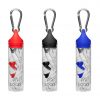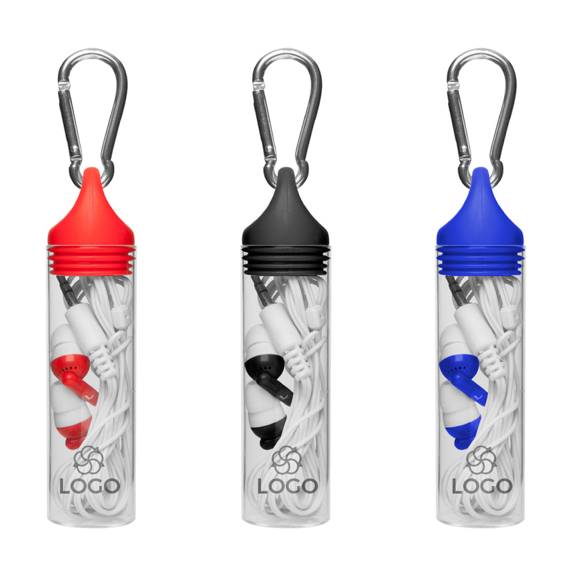 Estuche en forma de tubo translúcido y tapa engomada a presión en color con mosquetón metálico.