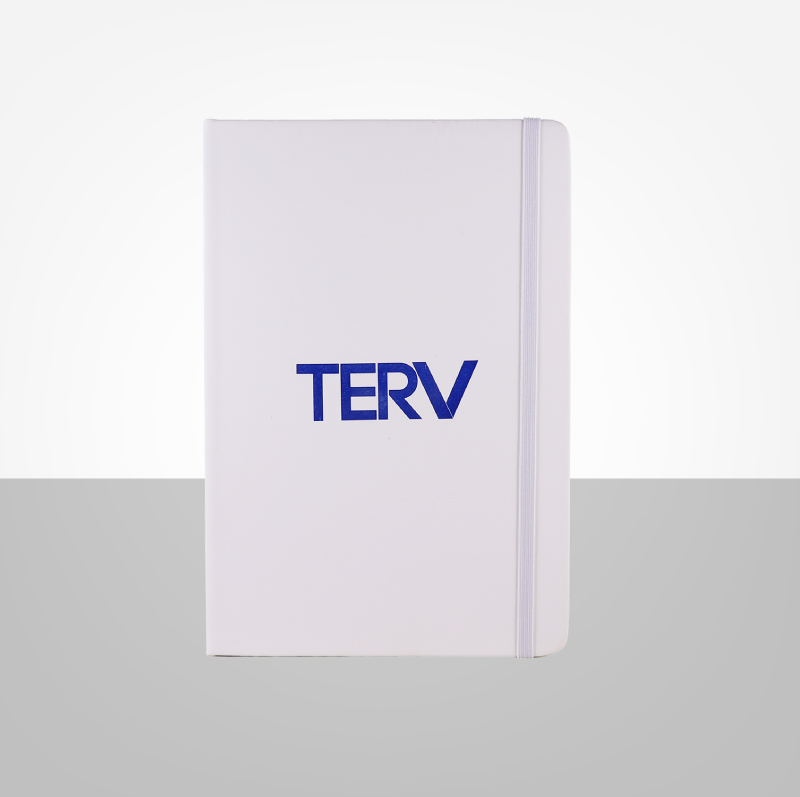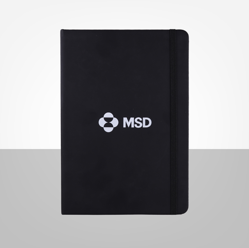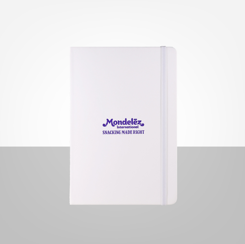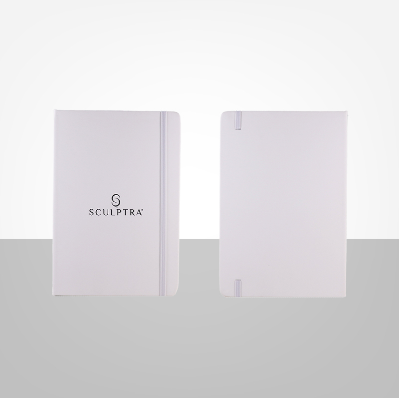 Cuaderno de tapa de PVC dura de PU con 64 hojas lisas ivory. Cuenta con cierre elástico y cinta marcadora. Medidas: A5 – 21 x 14.3 cm. Tahg 150.
