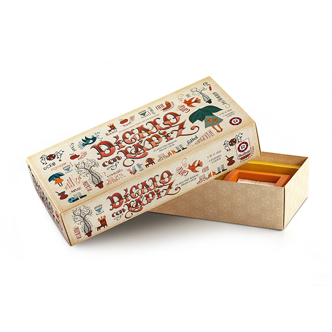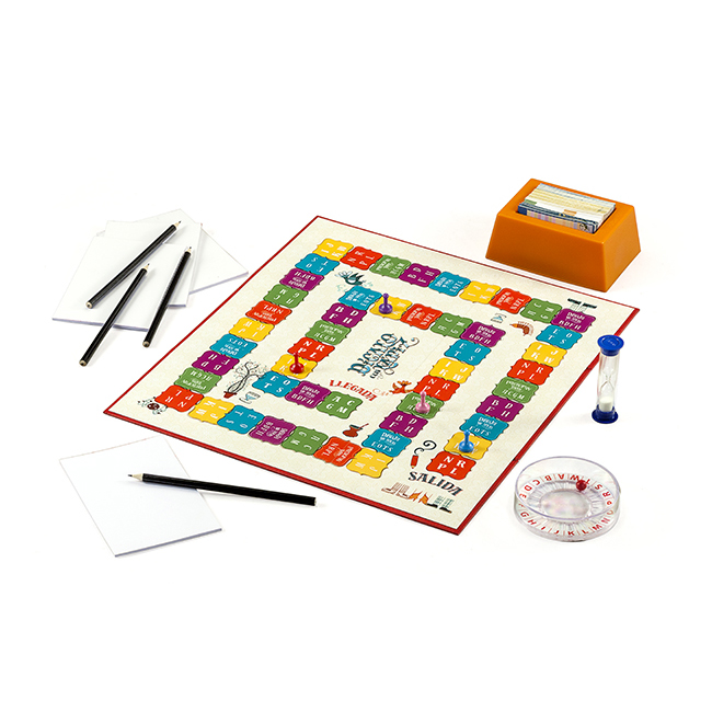 CONTENIDO: 1 tablero de juego, 72 tarjetas bifaz con 2448 palabras, 1 porta-tarjetas, 4 peones, 4 lápices, 4 blocks, 1 ruletra, 1 reloj de arena, 1 reglamento.