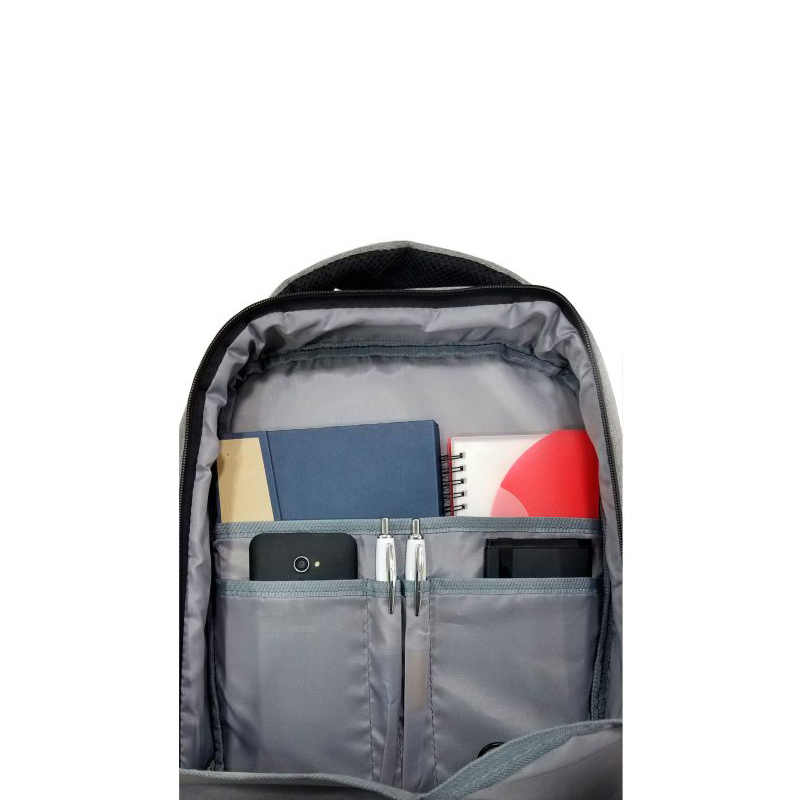 Confeccionada en tela polycanvas y base tela engomada. Posee 2 compartimientos principales. Frente con bolsillo. Asa de transporte reforzada. Tirantes y espalda acolchados con tejido 3DAir bolsillo oculto con cierre en espalda. Correa en espalda para sujetar a equipaje (CARRY-ON). Interior con 5 bolsillos y 2 porta bolígrafos. conexión USB y plug. (para power bank y auriculares).