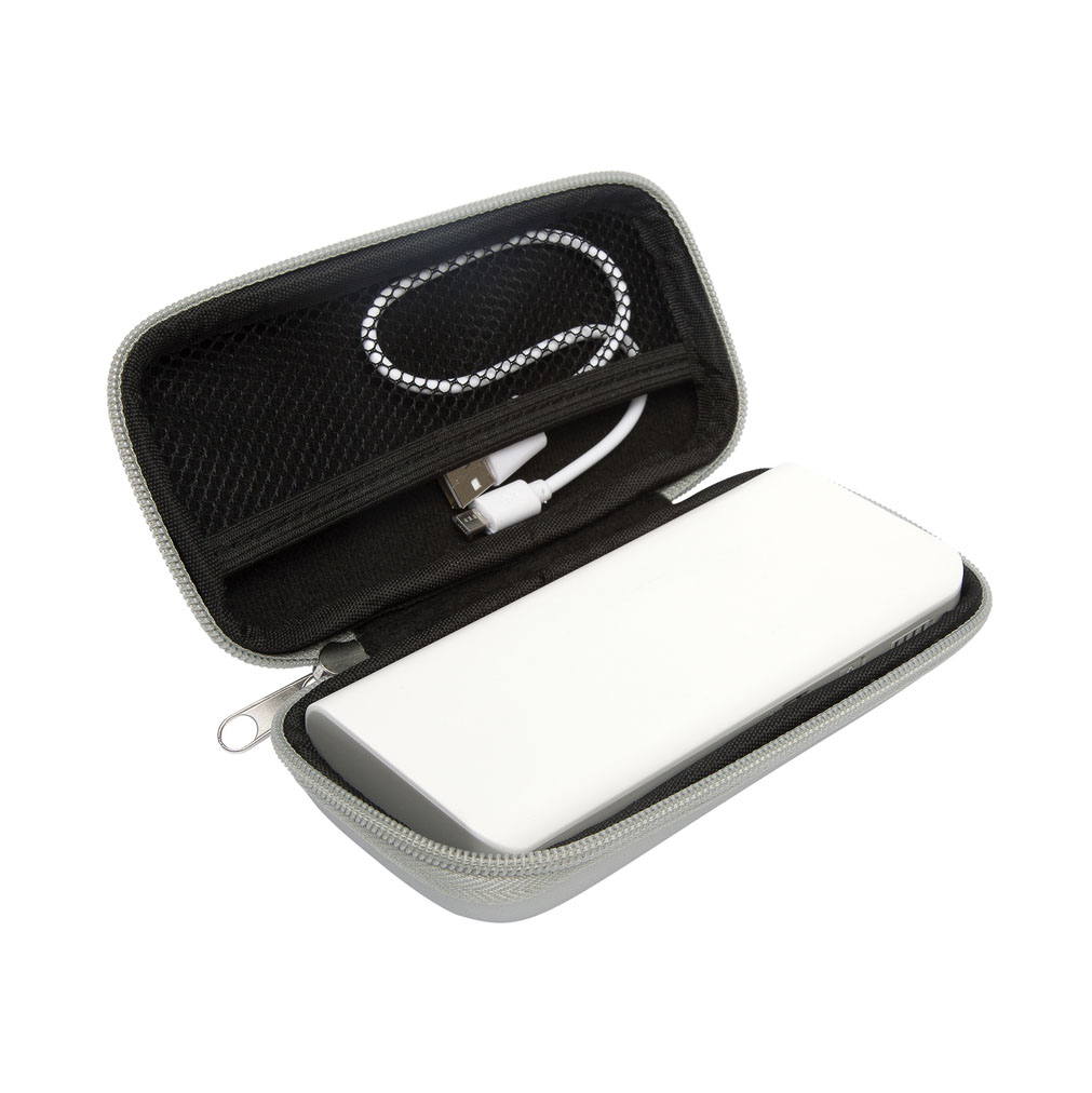 Batería con estuche en material eva pouch con cierre. Contiene un cargador móvil para celular, Mp3, Mp4 y cámaras digitales.